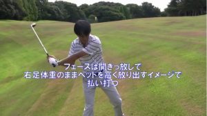 ユーティリティー(UT)クラブの打ち方 Lesson4|つま先上がりではフェースを開きっ放しで右足体重のまま「ヘッドを高く放り出すイメージ」で払い打つ